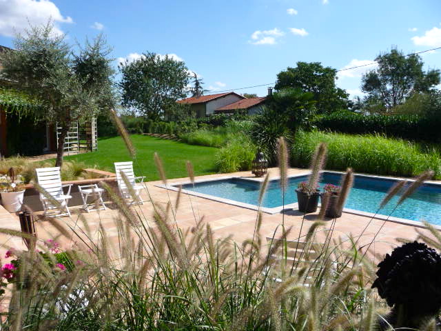 Aménagement d'un jardin de graminées. Mise en forme et modelage du terrain, création de l'accès à la piscine, arrosage intégré, gazon... Retour
